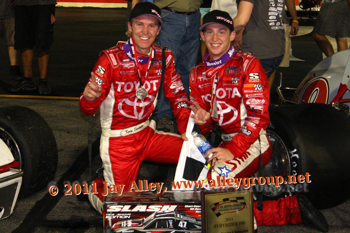 Paul Menard took his first Sprint Cup win in one of the biggest races of the year: the Brickyard 400. He managed to outlast Jeff Gordon who finished second. Numerous drivers ran low on fuel late in the race and were pedalling hard to make it to the finish. Menard survived a close call in Turn 3 when Landon Cassill spun and Menard had to go through the grass to miss him. Thirteen different drivers led laps and there were 22 lead changes in the 18th edition of the Brickyard. Kasey Kahne looked to have the field covered early in the race but got shuffled back on pit sequencing. Kahne led the most laps (48) and Jeff Gordon led the second most laps (36) with Menard leading 21 when it counted. This was a welcome victory for Menard and his father John, who was a longtime sponsor and car owner in Indycars without much success. Just rewards went to the winning team as Paul Menard kissed the bricks along with country music star Reba McIntyre and numerous other friends and family. It was a great day in Indy for the Menard family. Regan Smith took thrid ahead of Jamie McMurray and Matt Kenseth. Tony Stewart led 10 laps and finished sixth ahead of Greg Biffle, Mark Martin (who ran out of gas on the cool down lap), Brad Keselowski. Kyle Busch rounded out the top 10 after a rough day at the Brickyard for him.